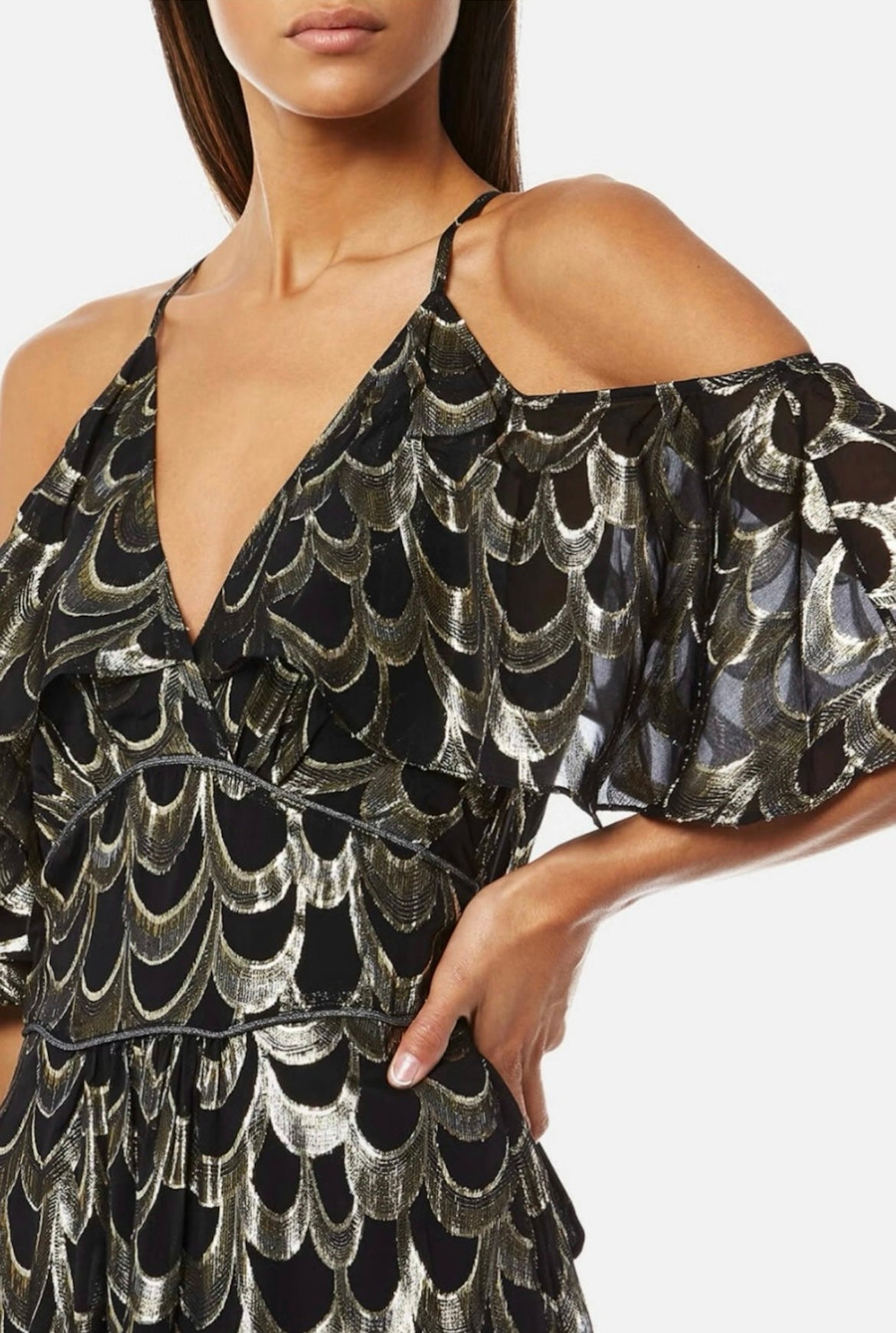 Gorgeous, elegant and flowy gown in golden pattern with spaghetti straps, piping details and ruffled skirt. Make a statement with this amazing piece from Perseverance London. A dress hire dream come true!