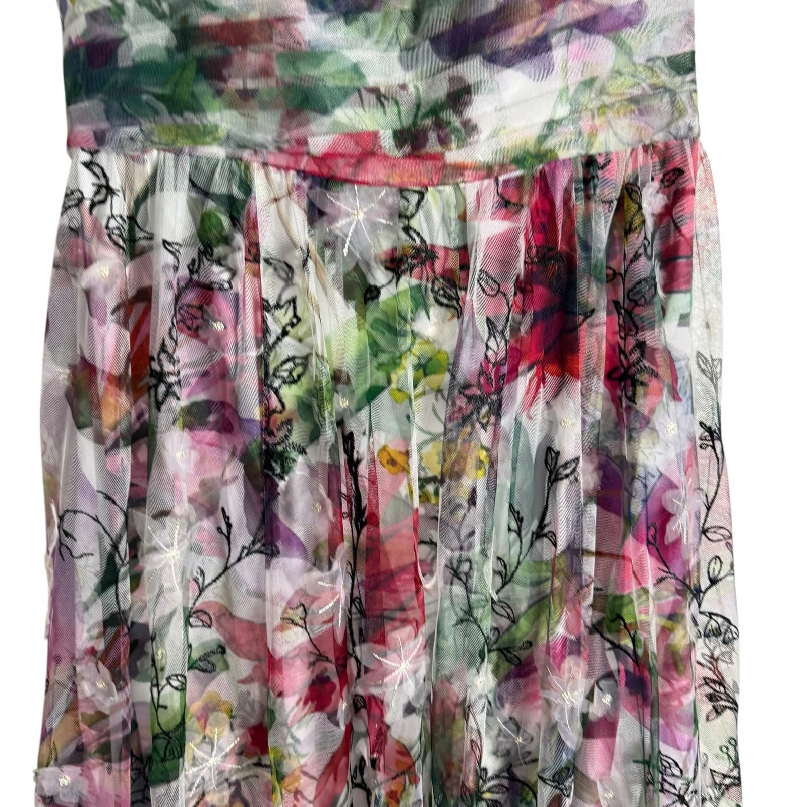 Shortened to 53” inches. Suitable for height 5 ft 4 in small heels. Flattering from head to toe, this enchanting floral Marchesa Notte summer dress features shoulders that can be worn off or on shoulders. This floor-length look has a signature floral pattern, whilst tulle panels and floral appliques bring an extra flair. Concealed zip fastening.