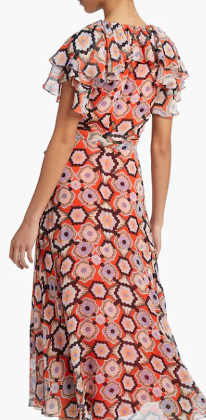 This dress is by Temperley London. 100% authentic. Fashioned from luxurious silk, this floral midi dress features a wrap design, flutter sleeves, and a plunging V neckline.