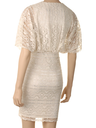For Sale or Hire. Covered in tonal shiny sequins and shell stones with kimono-style sleeves and a v-neckline, Melissa Odabash's ivory lace dress is an ultra feminine choice. Add a statement necklace and contrast this delicate texture with color-pop sky-high-heels. This dress looks great with a tailored boyfriend blazer and a chain-strap shoulder bag.