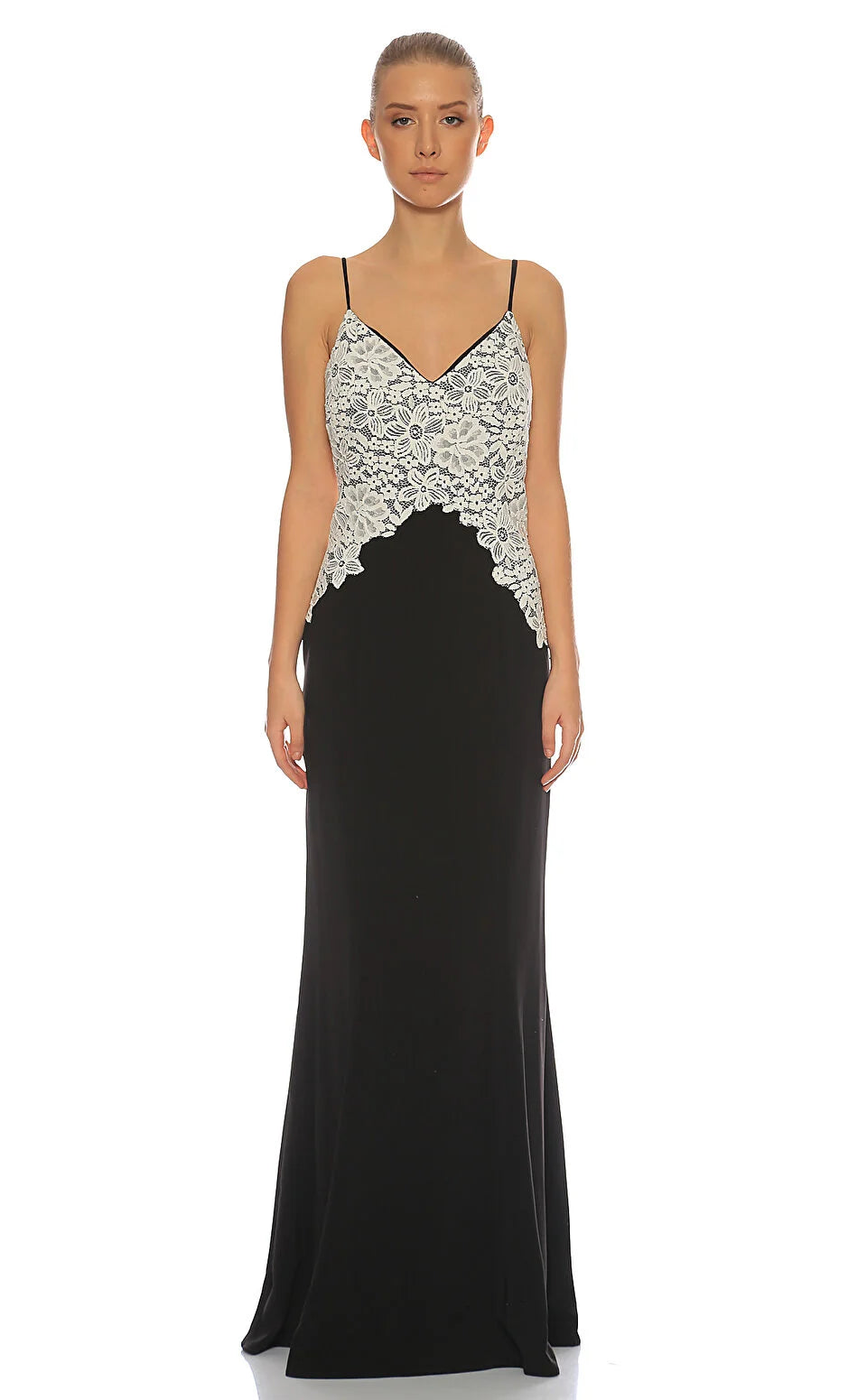 An easy choice for this season's black tie events, this beautiful black gown to rent is designed with a white lace metallic bodice. A perfect dress hire for a dinner or wedding guest dress at any time of the year.