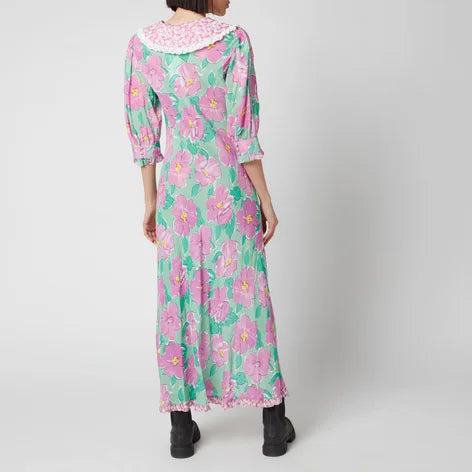 Pastel summer midi dress from RIXO. Rent this Rixo crepe dress for your next summer event. RIXO's Lauren midi dress features whimsical azalea blooms. It's made from crepe de chine and features feminine details including a crochet-trimmed collar and ruffles along cuffs and hem.