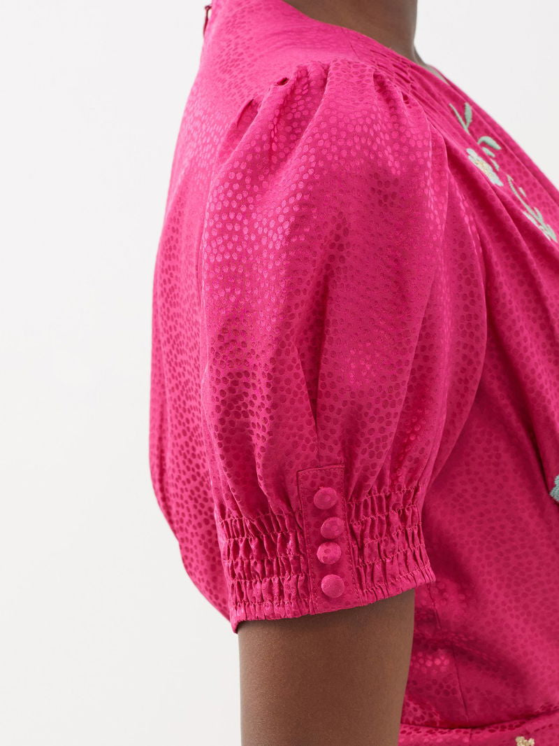 Rent this Saloni fuchsia-pink Lea dress - rendered from stamped silk-satin for a textured finish, with dainty blue and yellow embroidered florals framing the V-neckline. 100% silk