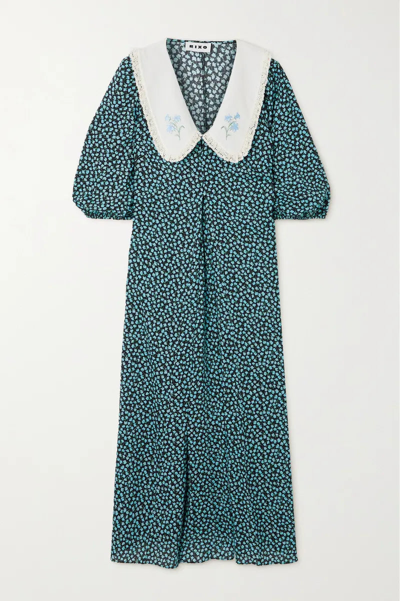 Blue summer midi dress to hire from RIXO. Rent this Rixo crepe dress for your next summer event.