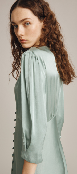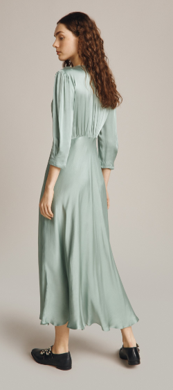 Call on the Madison to take the hassle out of day-to-night dressing. Its puffed shoulders and fabric-covered buttons nod to vintage-inspired styling while the front split adds a touch of femininity showcasing just the right amount of leg. Cut from a lightweight satin, it’s a classic silhouette that'll endure season after season. This GHOST The perfect dress hire UK for any smart occasion. Rent a dress, Designer dress hire.