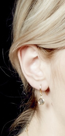 These demi-fine Mini Labradorite Round Stilla Drop Earrings feature two rose-cut labradorite gemstones set in 18 carat yellow gold plated sterling silver. Showcased in a spectacle setting, the gemstones are surrounded by a small gold plated rim.