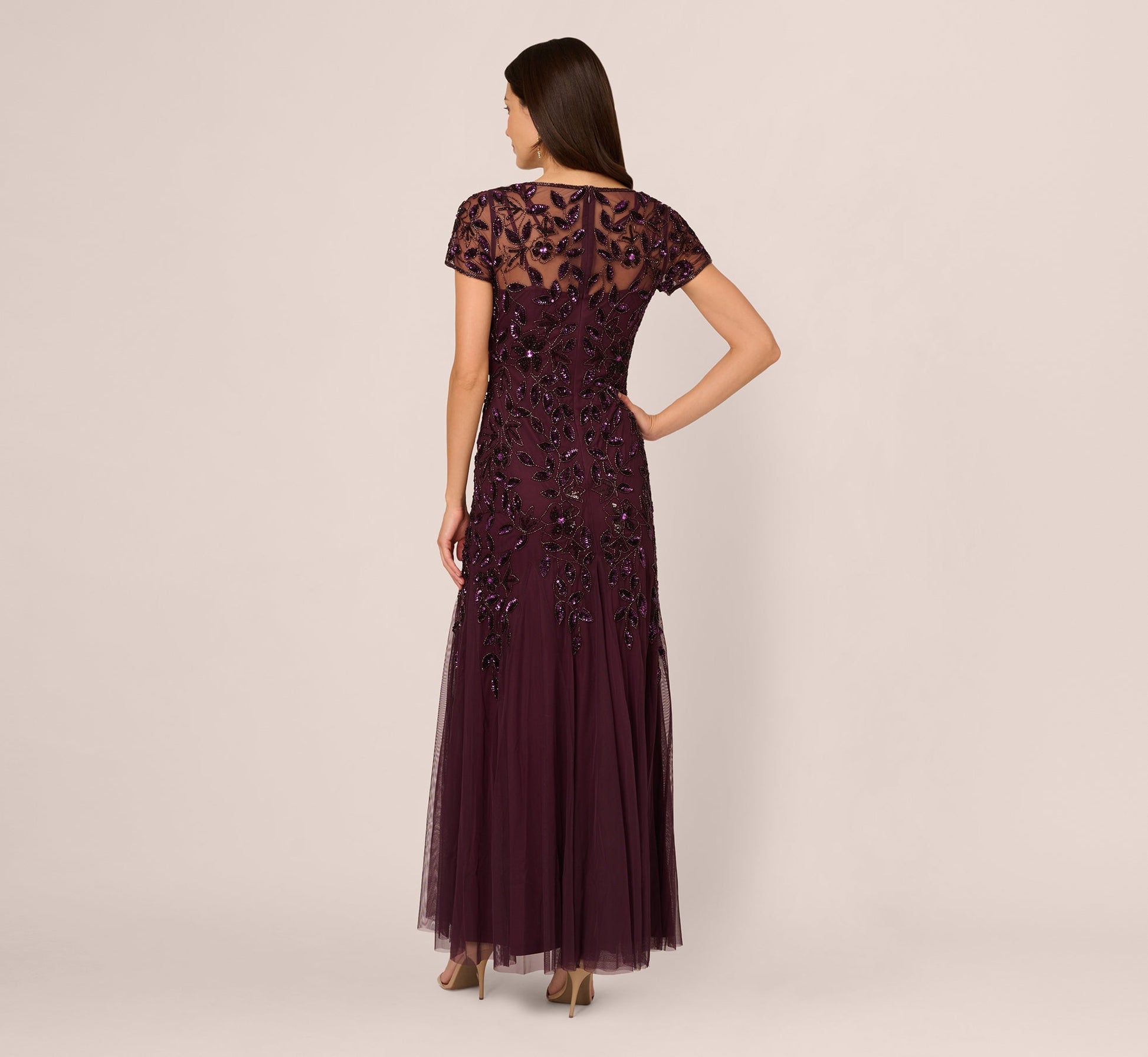 A long and romantic gown by Adrianna Pappel to rent for your black tie occasions. Covered in handsewn beading in a feminine floral pattern that catches the light with every twirl. A streamlined silhouette is eased with the mermaid skirt with godets to create the right amount of movement. No waist seam, sheer illusion yoke and cap sleeves. Sleek back zip closure.