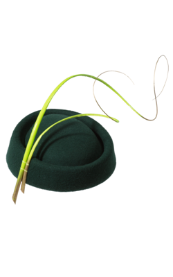 Green felt rolo headpiece adorned with neon green ornate quills with dipped gold ends.