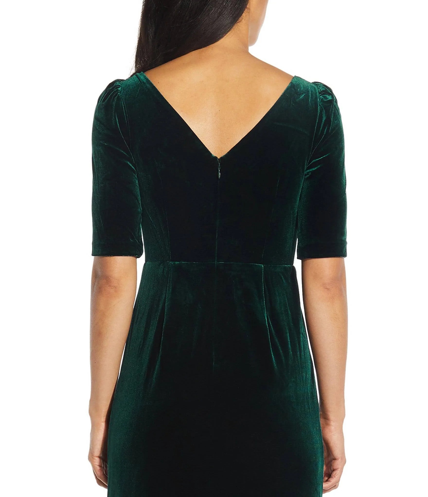 Ever timeless, this v-neck velvet gown by ADRIANNA PAPELL to rent is so elegant. This formal dress features a ruched bodice, long sleeves. This evening gown hire is a perfect choice for a black-tie wedding or formal gala. A zipper closure at the back.