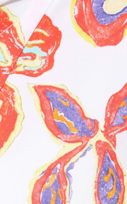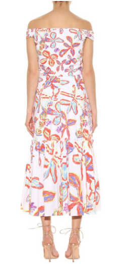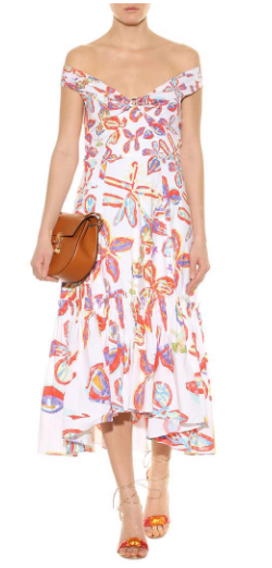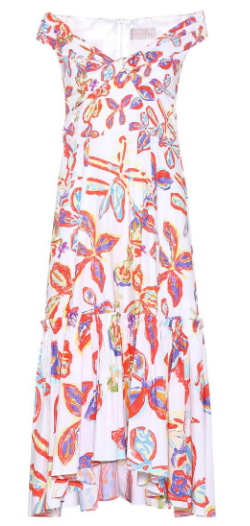 Peter Pilotto offers his version of the seductive off-the-shoulder design with this cotton dress. With its nipped-in waist, sweetheart-neckline and a flirty uneven hem, this is an elegant dress to hire!