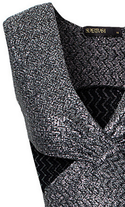 Maxi dress with thin shoulder pads by SUPERTRASH. High slit on right side and open sections at waist. Semi-stretch material.