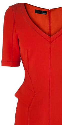 For Sale. Ex-hire stock. Slight fading to the shoulders. Photos on request. Dress by British designer AMANDA WAKELEY. This is such a failsafe dress, and flattering for every figure. With the body-sculpting scuba fabric, the waist-defining peplum and stylish short sleeves.