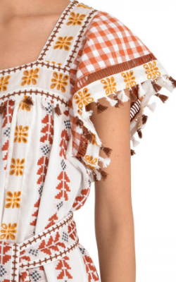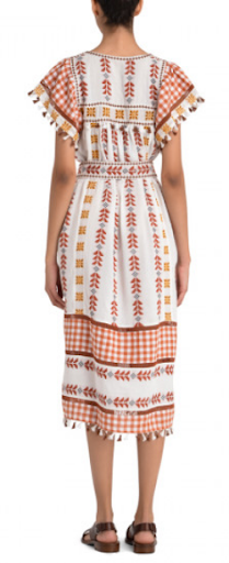 Dodo Bar Or's Teresa long dress with embroidery, made in pure cotton in white, black and rust hue, embellished with a double row of tassels. Spring/Summer 2019 collection. The perfect midi dress hire for your holiday or summer event. 100% AUTHENTIC