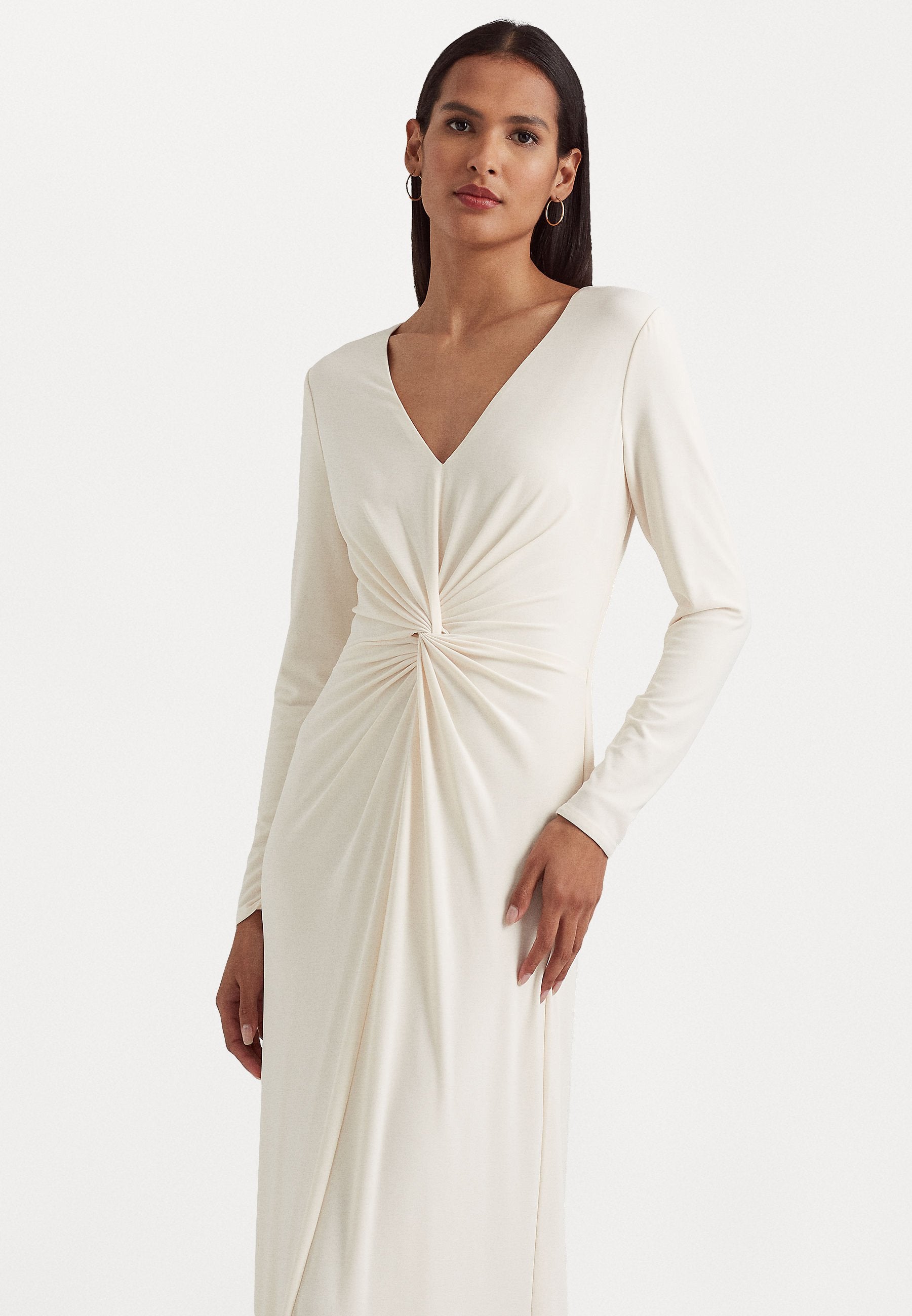 Rendered in stretch-infused jersey for a soft hand and ease of movement, this evening gown is characterised by a chic twisted detail on the waist. UK size 12 has a 150.5 cm body length and a 61.6 cm sleeve length. Concealed centre back zip with a hook-and-eye closure.