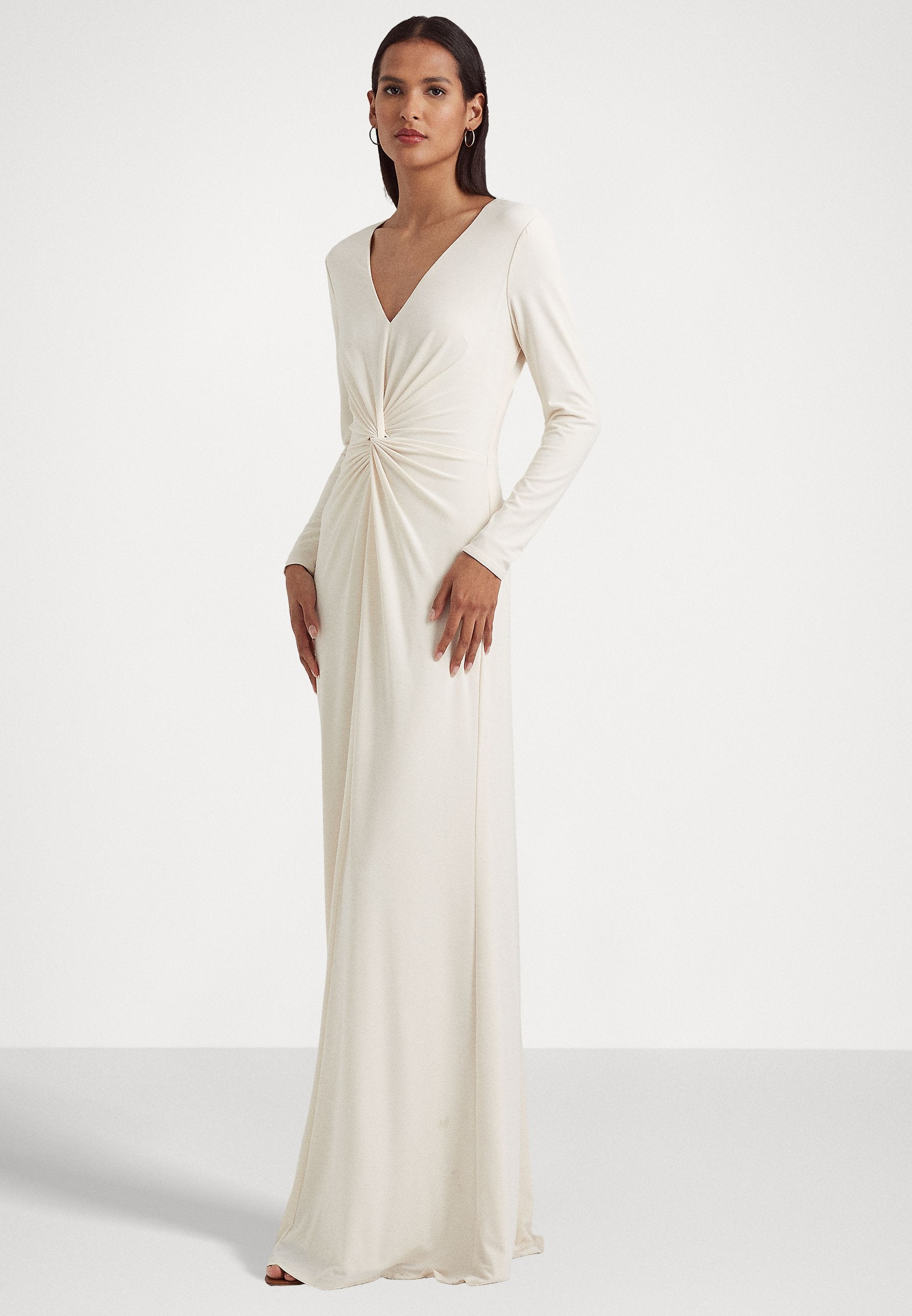 This elegant cream gown to hire by Ralph Lauren is a beautiful black tie dress hire choice for a dinner, wedding or smart occasion at any time of the year.